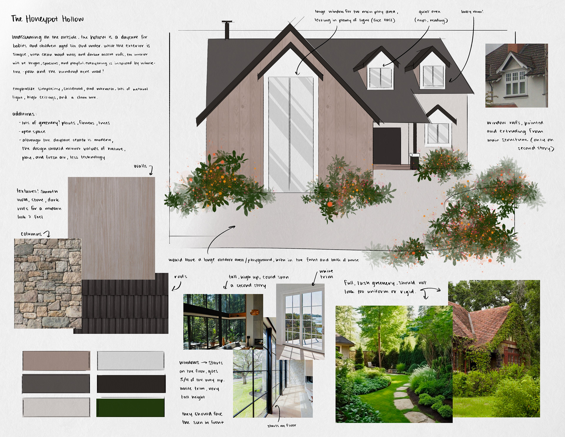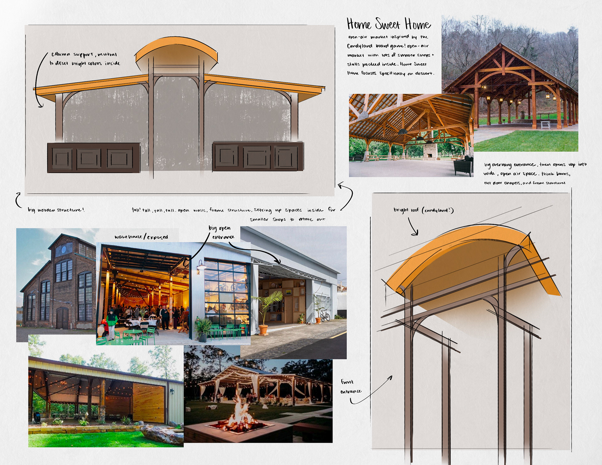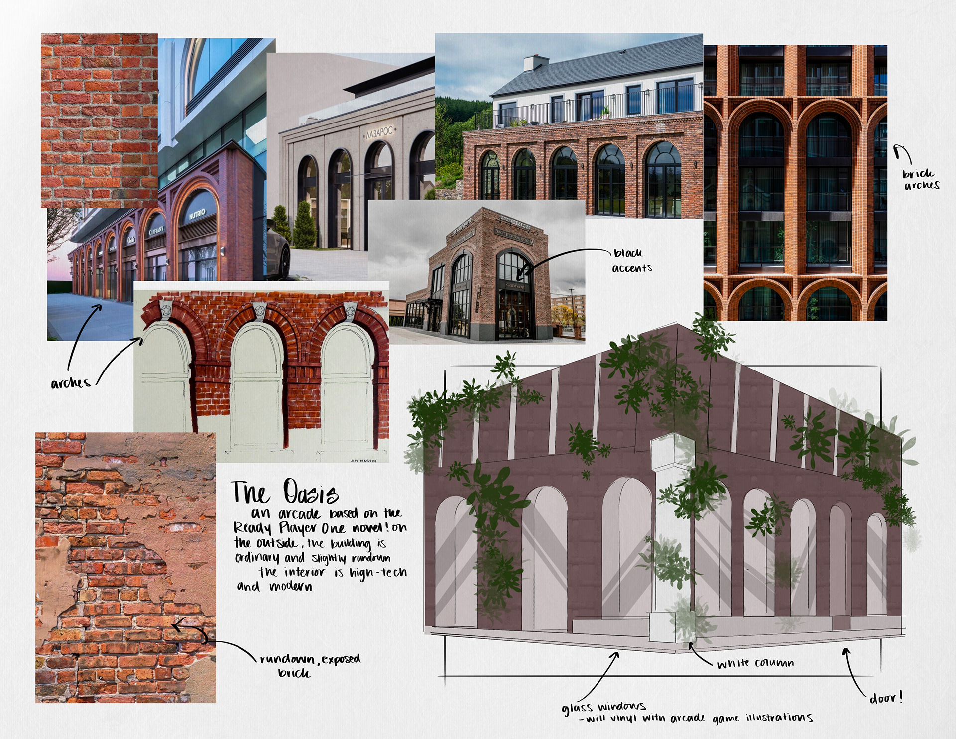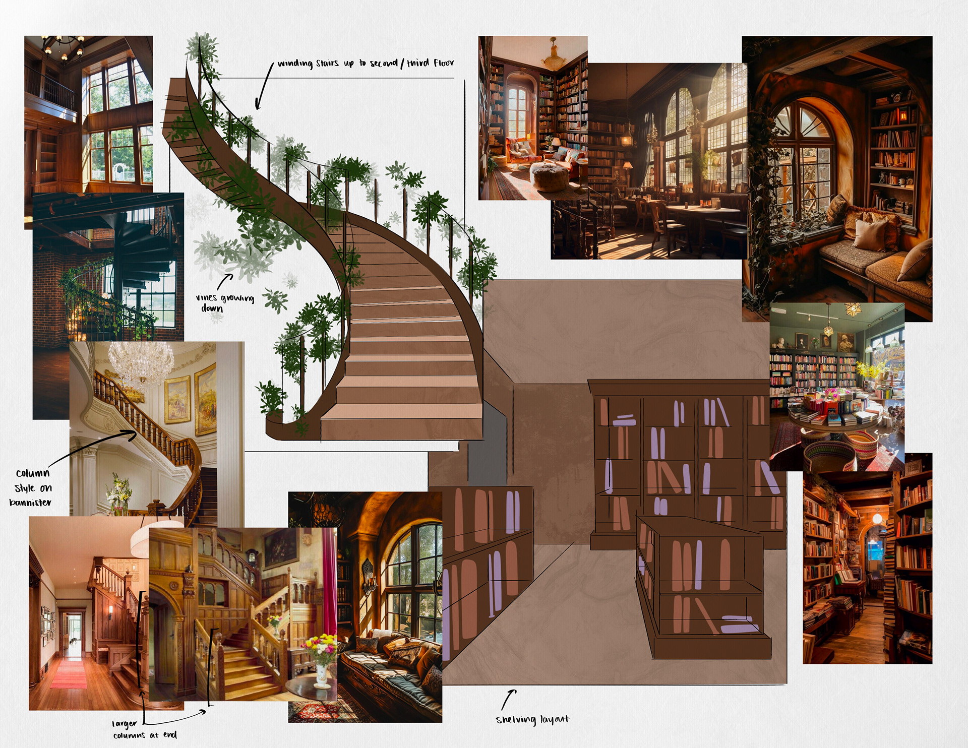 I researched and combined photo references to sketch over, adjusting when necessary to fit my vision. After finalizing the sketch, I added moodboards that would more clearly show the concept.