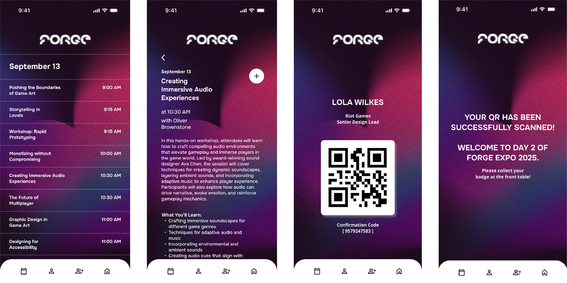 FORGE Expo is a conceptual game developer conference that helps attendees grow, connect, and build new skills. The goal was to create a strong, modern brand that feels high-end and inspiring.